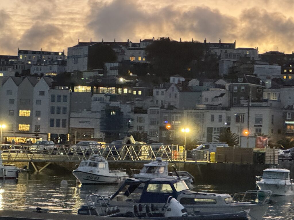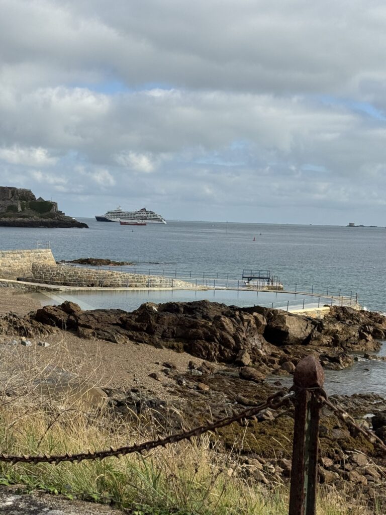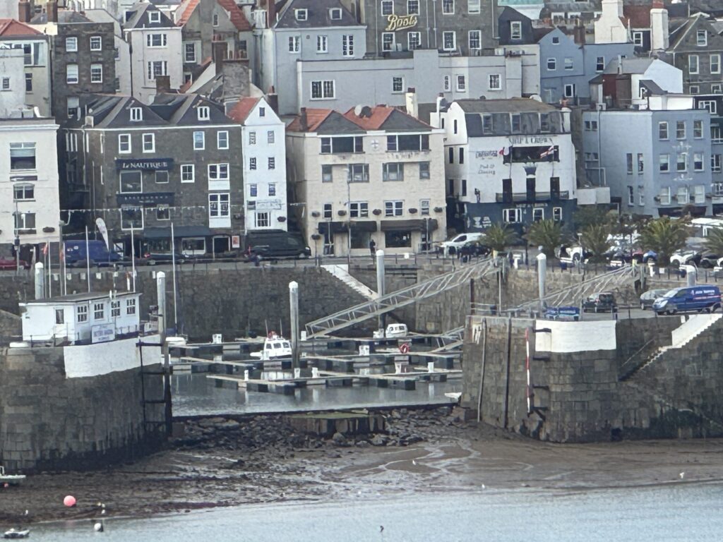 We motored into St. Peter’s Port in Guernsey around sunset on Wednesday. There was a discussion about whether we would cast off on Thursday or Friday, and the decision was to stay two nights at the marina. We were in Guernsey to accept legal ownership of the boat which was accomplished on Thursday morning with the help of Ocean Skies. Jay and Mark spent the day chasing a leak in the forward head. Cat provisioned and cleaned the boat. I spent the day walking around the port, touring Castle Cornet, the local art museum, and Candie Gardens. Victor Hugo was banished by France to Guernsey for 16 years, and tributes abound. There are three public salt water pools from the Victorian era, which were lovely. Guernsey has an astonishing tide of 30′! Much of the port is dry at low tide.
