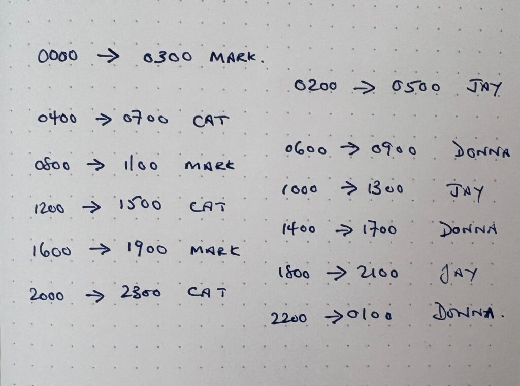 I have attached our watch schedule for the next four days.