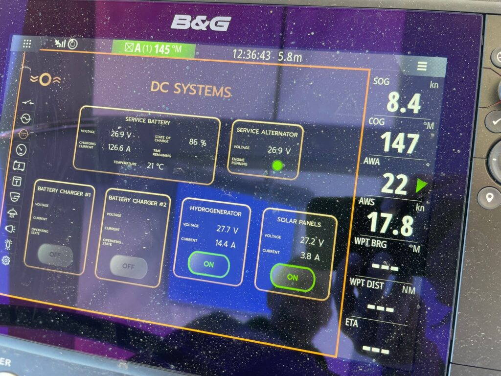 This post is testing two items: first, I (Jay) can successfully post. The second is about our boat, WELCOME. At our request, Oyster installed two retractable Remoran Hydrogenerators on the stern of the boat. This was a first for Oyster. These are a couple of pictures of the initial test run. The generators are producing 14.4amps @ 27.7 volts (the boat has a 24, not 12 volt system). The picture also shows that the tiny solar panel is producing 3.8amps. This is great. Even though WELCOME is a sailboat, it requires power to run the auto-helm (self-steering), navigation equipment, Starlink, induction cooktop, lights, flush the heads (toilets), and make water, etc. We don’t yet know precisely what our power consumption will be – and candidly, I hope that the hydrogenerators produce a bit more than shown during this test run. Still, having these units producing power 24×7 while we are underway is the equivalent of running our generator for about 2.2 hours a day. Not running the generator for two hours a day saves fuel (very helpful on long passages) and makes for a quieter sail. The hydrogenerators and small solar panels also create some redundancy for battery charging. If you follow this blog (and we continue to post), you will be amazed at all the things that break on boats.